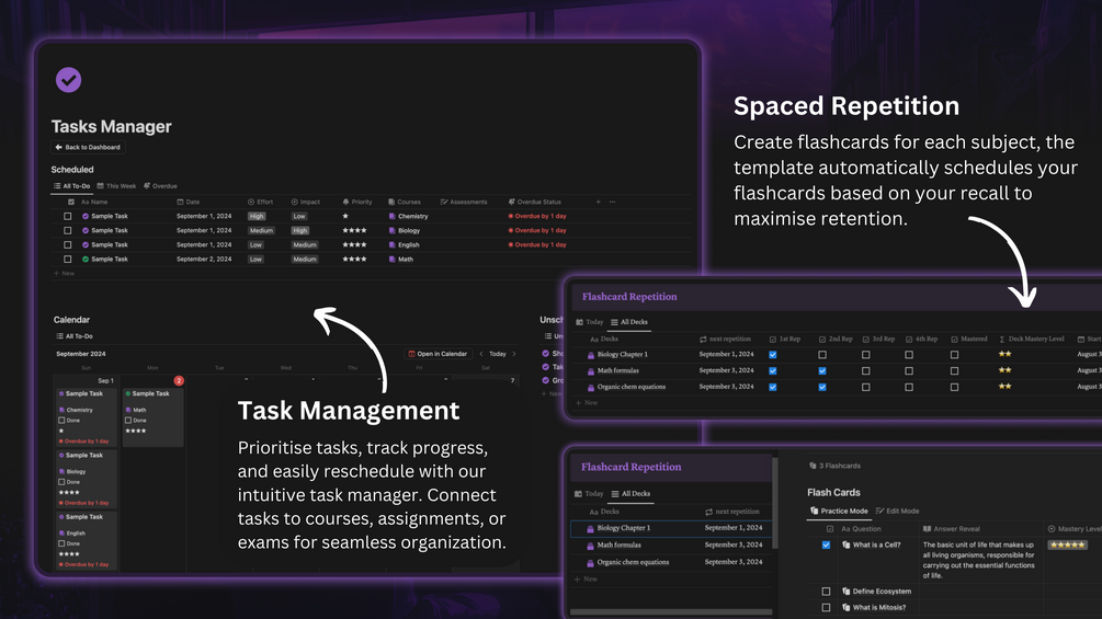 - Task Manager: ✅ Create and manage tasks related to assignments, projects, and studying. Prioritise tasks, set deadlines, and track your progress. Use the Kanban method or other task management systems.