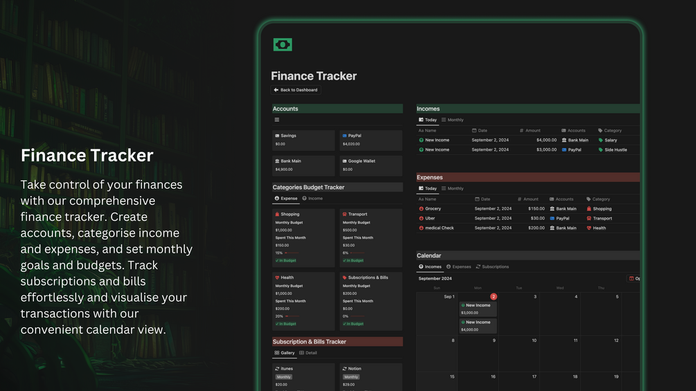 - Full Spread Finance Tracker with Subscription Management: 💰 Create a comprehensive financial tracker to manage your income, expenses, and savings. Track subscriptions, set budgets, and monitor your financial health.