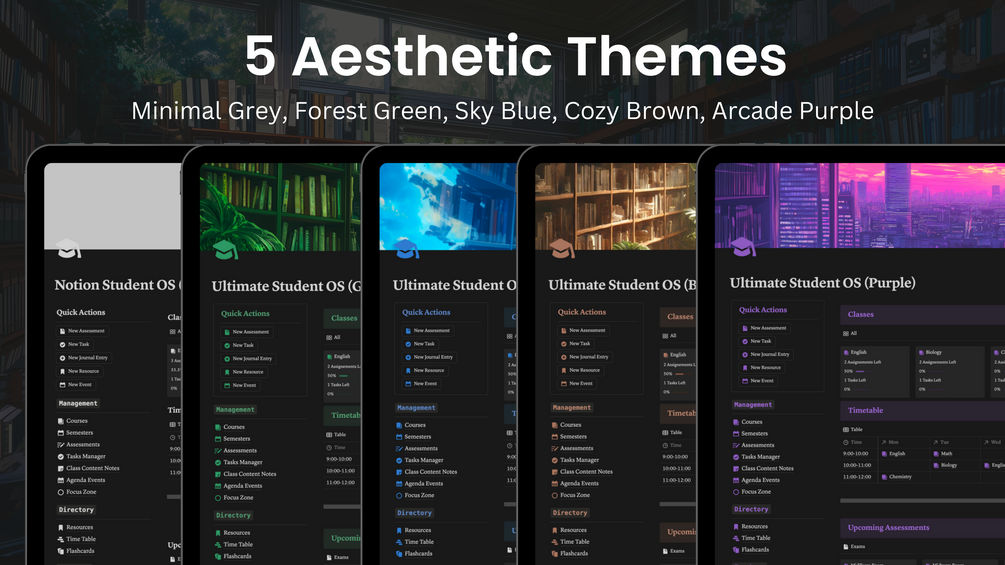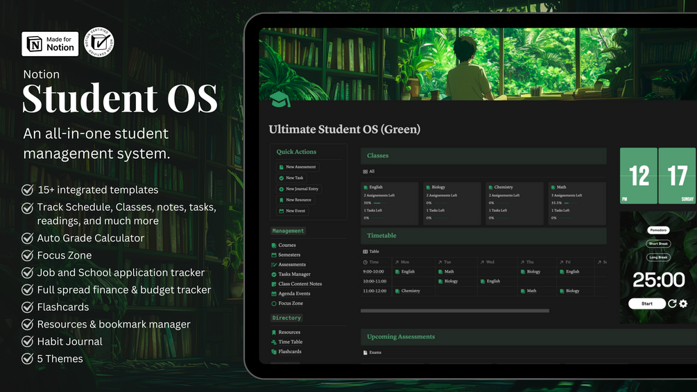 Introducing the Ultimate Student OS, a comprehensive Notion template designed to streamline your academic journey and enhance your productivity. This all-in-one workspace offers a wide range of features combining 15+ templates to help you stay organised, manage your time effectively, and achieve your academic goals. From tracking classes and assignments to managing your personal development, this template has everything you need to succeed.