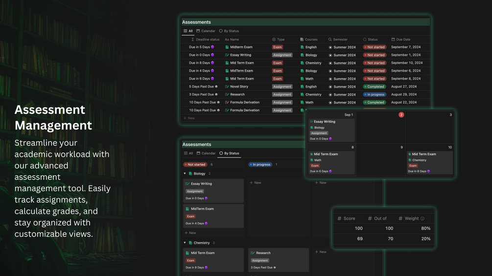 - Assessment Management: 📝 Create a detailed assessment tracker with due dates, deadlines, grading criteria, and notes. Add attachments for relevant materials.