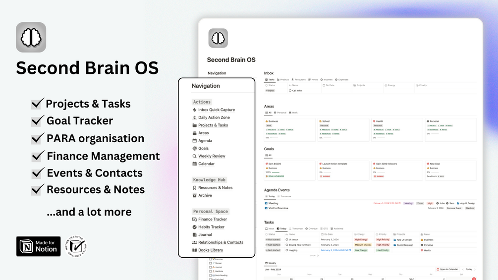 Supercharge your daily life with the ultimate second brain system. Organise and manage your life easily by connecting resources, notes, events, and finances to your projects. Get things done efficiently.